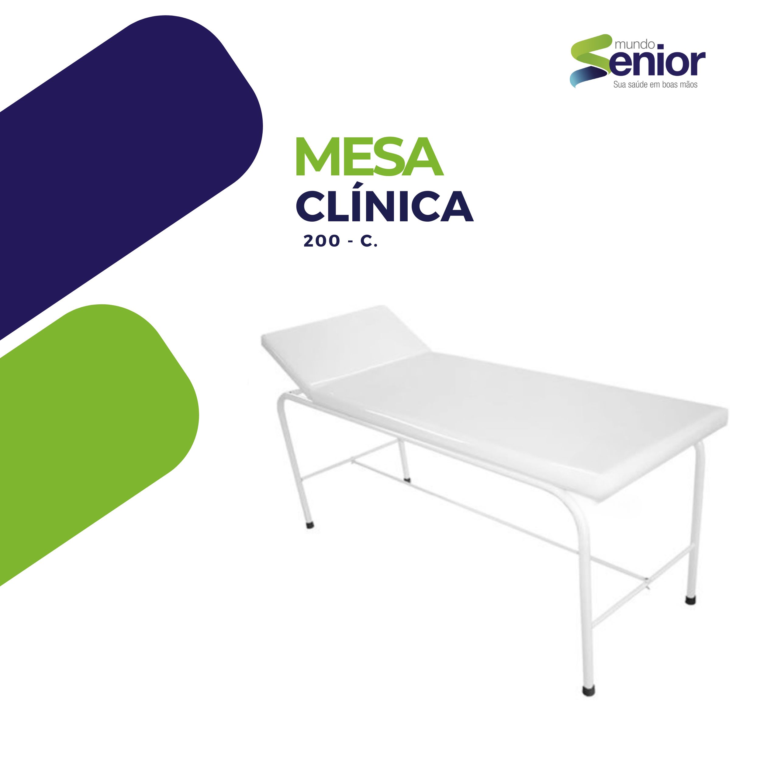Mesa para exames clínicos, estrutura construída em tubos pintados 1 ¼” x 1,06mm, trava em “H” em tubos pintados de 5/8” x 0,9mm. Leito construído em chapa de aço pintado 0,90mm, cabeceira regulável através de cremalheiras. Pés com ponteiras.