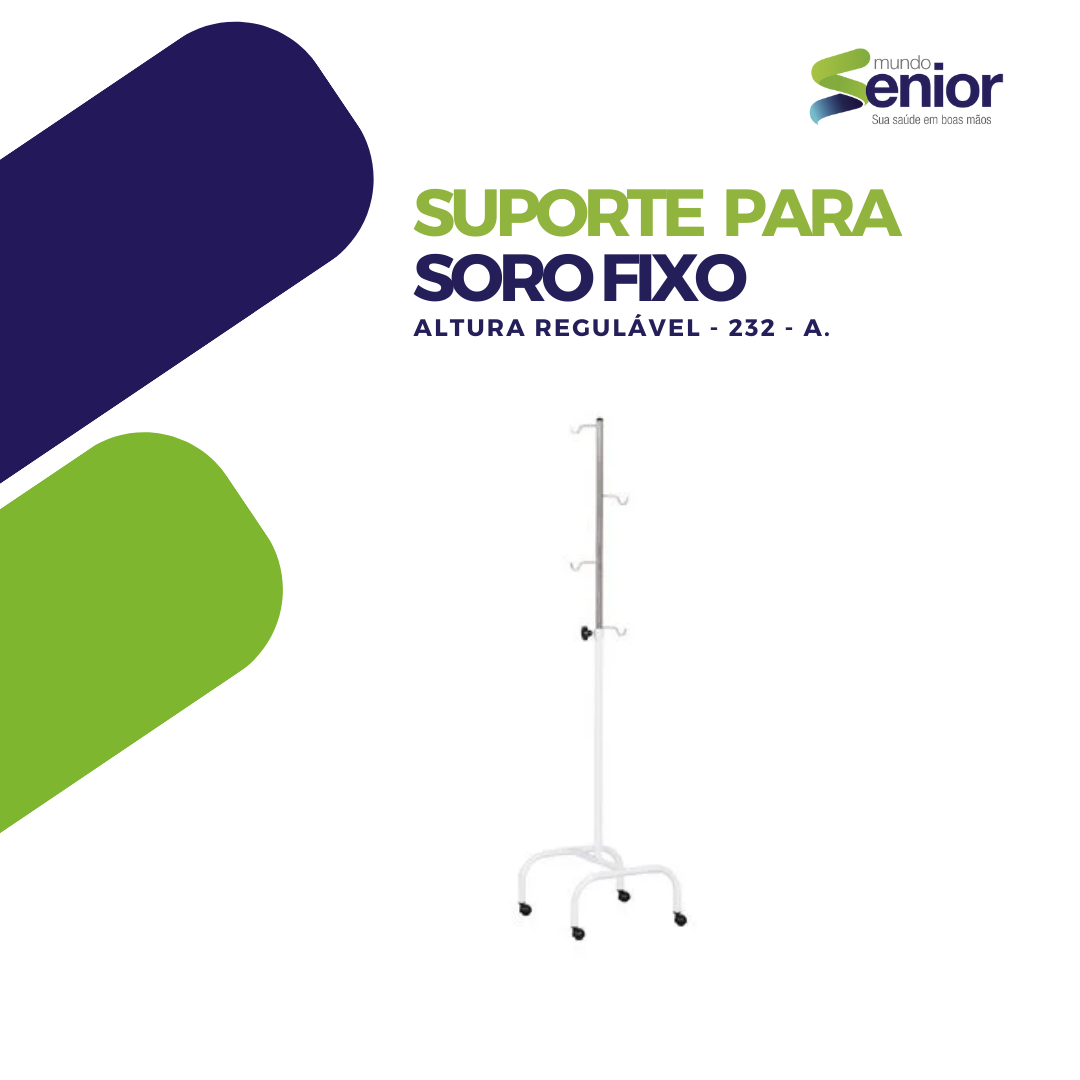 Suporte para soro altura regulável, construído em tubos inox 7/8” x 1,2mm, pés com rodas, haste em tubos inox de ¾” x 1,0mm com 4 ganchos em “X” na parte superior.
